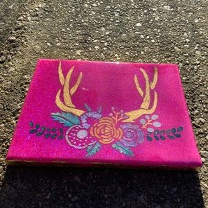 Original resin & acrylic painting done on an 8 inch x 10 inch stretched canvas. The background contains metal flakes which sparkles . The antlers are made using liquid gold foil and the flowers are acrylic color shifting paint. Contains 5 layers of resin to add depth and a clear glass like finish. Autographed & video on my Instagram