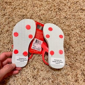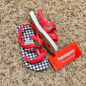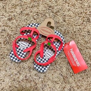 Girls navy and white gingham soles flip flops with red straps. Straps go around back heel as well. Cherry charm accenting mid strap. Size 10C.