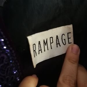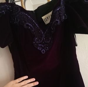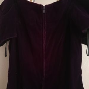 Structured, form fitting, velvety feeling, off the shoulder with straps. Love it, just have too many dresses. Pics are making it look black when it's far away but it's more like a rich deep purple.