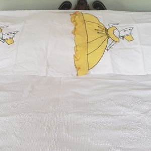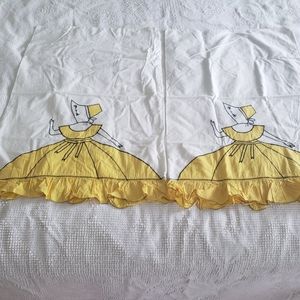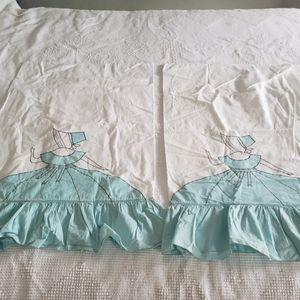 Two pairs of beautiful vintage pillowcases depicting women wearing bonnets and full skirts which are part of the pillow ruffle. Unique one of a kind vintage linens! No holes. One tiny stain on one blue case. See picture. I'm talking 1-2mm .