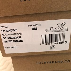 Lucky Brand Women’s "Gadine" Taupe Suede Sandals in the sizes 7.5M, 8M or 9M in the color stone rock which is taupe color in genuine suede leather. New with tags in excellent condition never worn still in the box. Please do look at pictures for details and measurements thank you and Happy Poshing!!!