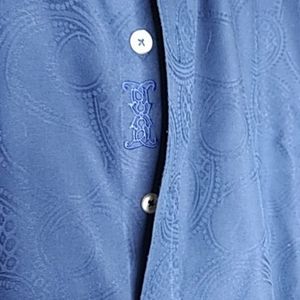 Robert Graham Blue Jacquard print button down shirt. Really a great shirt but my dad says it no longer fits. Knowledge Wisdom Faith at the bottom, Robert Graham at the collar and embroidered brand. This is a size Medium. Measurements are Chest laying flat from pit to pit is 22 in. and 28 in from shoulder hem to bottom hem of shirt. Last picture shows a small pull in fabric priced accordingly.