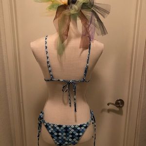Large matching size top and bottom 👙 super cute just fits me more like medium. Tags state L. Scales are 3 shades is blue. Adjustable tie on top and bottom.