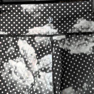 Lululemon size 8 Wonder under polka dot and cloud patterned leggings with hidden pocket. Great condition see pics for details color is more like a light pink dot then true white. All of my Lulu's are washed on delicate and hung dry.