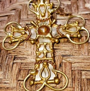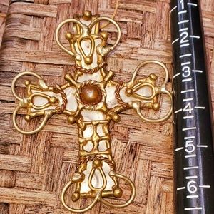 A vintage cross of raw stainless, copper and brass mixed metals pendant that measures approximately 3" . The bail opening is large enough for your thick necklace and will look awesome either over a silver or gold chain.
