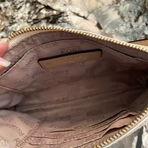 MK wristlet or small bag, strap is changeable (see photos). Zippered outside pocket and inside there is a pocket and credit card slots. Gold hardware, please see the pictures there is some wear on the pull and strap hardware. The matching handbag ๐ is in my page also!! Bundle for a bundle discount ๐ค!!