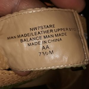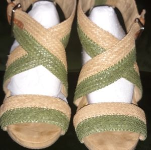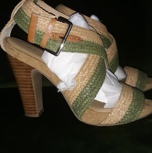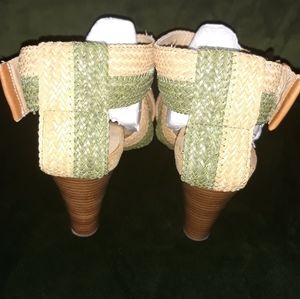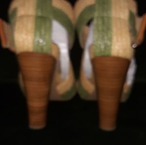Green and Tan Cross Strap; Platforms; Leather Upper; Size 7.5; Approx. 3.5" Heel