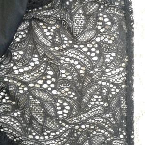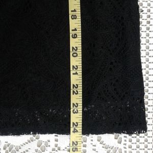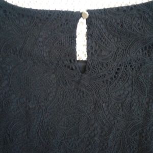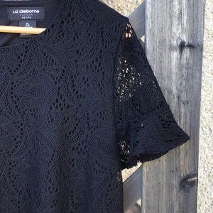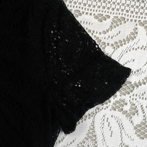 Liz Claiborne pretty black lace short sleeved top. Nylon/Spandex, lining polyester. Button in the back. Nice shape. Measurements in pics. I40.