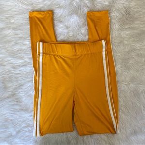 These leggings are soft and stretchy and perfect for a easy day in or a run to the gym. They’re a golden yellow color. Two white varsity stripes down the side and an elastic waist.