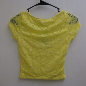 NWT yellow Guess lace crop top size XS extra small. Floral lace pattern throughout. Fully lined except for the sleeves, which are just the sheer lace. There is a subtle orange discoloration on the front of the top below the neckline (see last photo where I am pointing to it) - no idea what it is or what it's from, since this top has never been worn. It can probably be washed out. The price will reflect this flaw. Original price: $44.50.