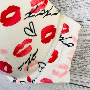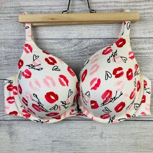 Cacique Lipstick Kiss Print Full Coverage Bra. Womens Size 42D. White with Red, Pink, and Black. Adjustable straps. Back hook closure. Mild discoloration as pictured but overall good condition.