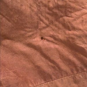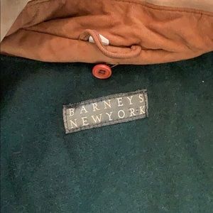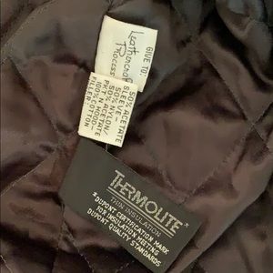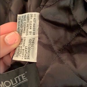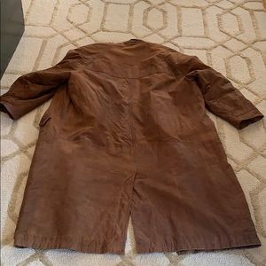 In good condition. Minor discoloring on the inside (which doesn’t affect the wear on the outside) and one small tear on the back of the jacket. Has lots of life left. About 52 inches long. Very warm. Kind of like a leather bomber trench coat. Size large (runs true to size). Hunter green interior.