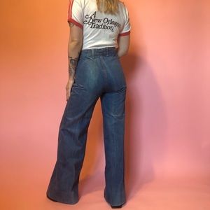 Paris Blues vintage 1970s wide leg jeans!! True bell bottoms! These are absolutely insane 🤎🤎 unisex! They’re labeled men’s 34, true to size. Best for a woman size L, but they can totally be belted. Be sure to look at measurements. Perfect condition, no flaws!