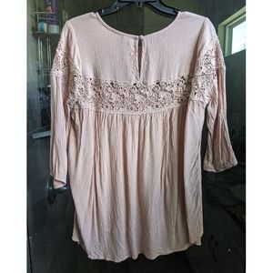 EUC Torrid size 00 blouse. Constructed from a soft pink gauze, this billowy blouse is perfectly accented with tonal crochet lace along the yoke and sleeves.