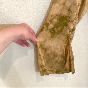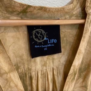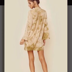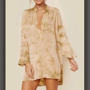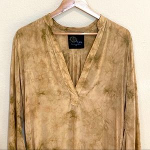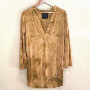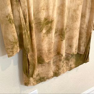This fun and stylish Blue Life boho style tie dye dress is perfect for your next vacation. Wear as is or over a swimsuit as a coverup. It has long sleeves w/ a slit at the end of each sleeve. It has a deep v-neck neckline, and it is a high low style dress with two slits on either side at the bottom of the dress. Has an oversized fit.