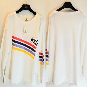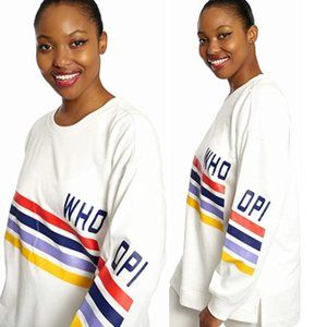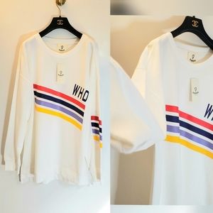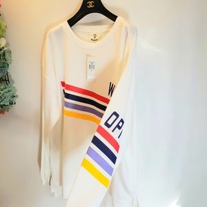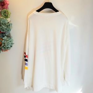 Oversized white pullover with multi stripes and verviage. Ribbed Trims. Soft & smooth.