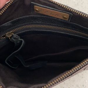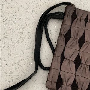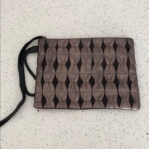 Beautiful eggplant bronze and black leather clutch, zips closed. 10” W X 8” H brand new never used