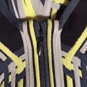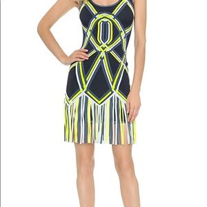 Swingy fringe pours over the hem of this curve-hugging Herve Leger dress. Neon accents add a lively touch to the intarsia cage pattern. Sleeveless. Hidden back zip. Unlined.