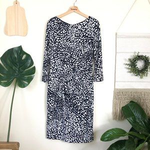 Adriana Papell Navy & White Leopard print Midi Dress 3/4 Sleeves Round Neck Size 14