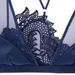 New In Package Victoria's Secret Luxe Lingerie Ensign Blue Unlined Dragon Lace Plunge Bra, Size XS. Mix of satin & nude tulle creates a delicate tattoo effect in a daring sexy plunge bra w/ a sheer mesh front & intricate dragon lace back. Features wireless cups, sexy plunge neckline, adjustable crossback straps, and side hook closure. Show off this bra with your favorite mesh back top!