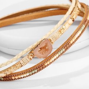 This faux leather bracelet is accented with stone, beads, and rope designs.