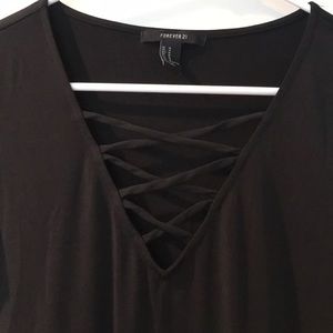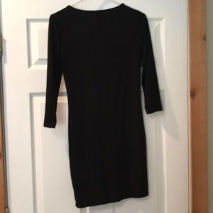 Adorable black dress - casual or dressy - criss cross in front “v neck” area. No material tag (taken off) but is like a polyester and spandex type material - washed in the washer and always hung dry. 3/4 length sleeves.