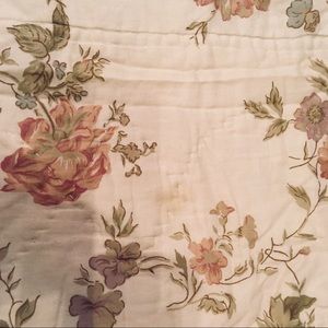 Gorgeous! Peach flowers on cream ground with sage ruffle. Reverses to sage with peach n ivory buds. Quilt is machine stitched, but there is much hand stitching along borders n thruout. Tho full size, I show it on a twin bed with sides touching the floor. Closeups show a couple faint stains which luckily are within the pattern— and they may wash out. I have a big box so am ready to ship!