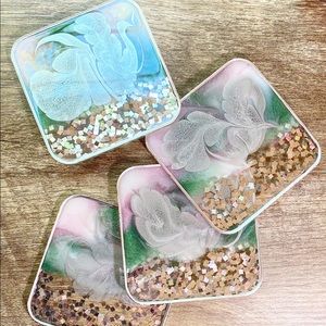 Handmade resin square coasters for home decor. Hand painted with metallic silver abstract swans & feathers, then sealed with a clear coat. A touch of metallic silver paint was added to the top trims to frame these pieces. Colors used: cool green, soft pink & white with silver chunky glitter. Perfect as a house warming gift for functional & beautiful home decor. This set is made with food grade resin and high quality pigments. Follow my IG or FB page @s.n_resin for more photos or inquiries.