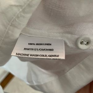 100% Irish linen white button up shirt from Eileen Fisher. Size small. Mandarin collar with linen covered buttons down the front. Cinched slightly in the back. Excellent used condition.