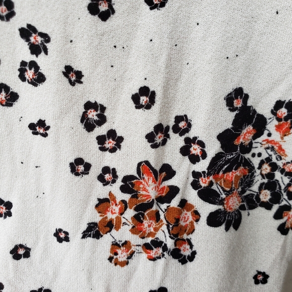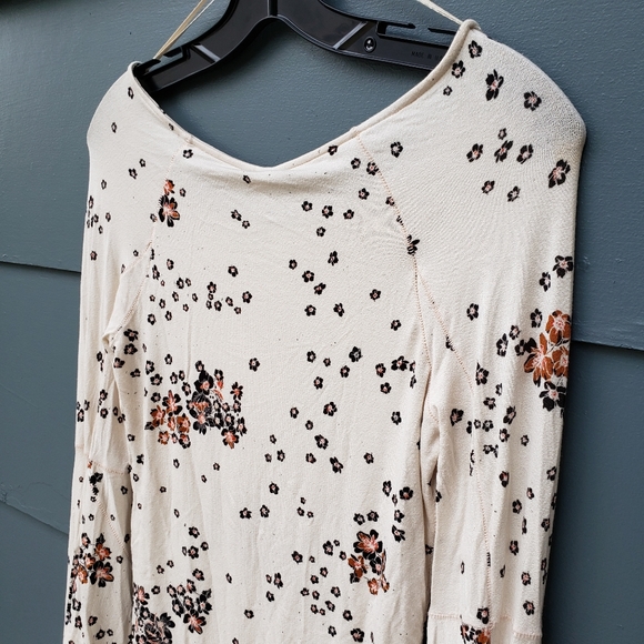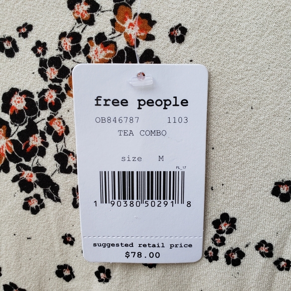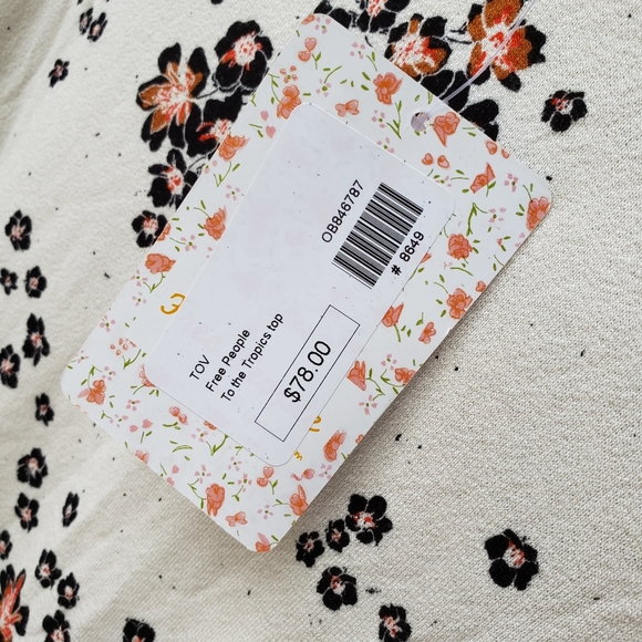 Brand new with tags Free People "To the Tropics" top in the "tea combo" color (cream background with black and orange allover floral pattern). Size medium. A wide bateau neck gracefully frames this versatile top with stylish blouson sleeves and a curved hemline. Fitted bodice with loose sleeve ends. Fabric is very soft and stretchy - 95% rayon, 5% spandex. Comes from a non-smoking home.