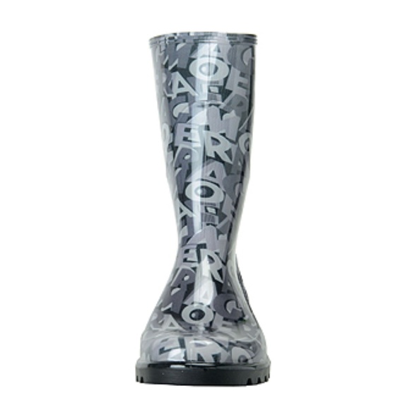Eclectic, collaged logo lettering lends standout style to a jelly rain boot set on a sturdy lug sole to keep you dry, stylish and stable on slippery sidewalks
