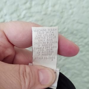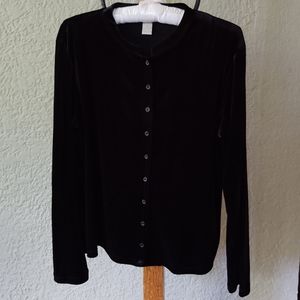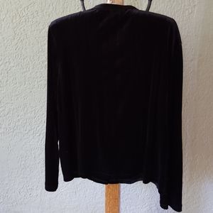 Great for holidays and special occasions! This black velveteen top has a band collar, full button-down front, and long sleeves. Soft polyester with a bit of spandex. Gentle wash and tumble dry. Like new condition. Smoke-free home.