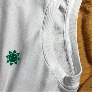 This was a thrifted snatch! There are no tags or brands but it is a very cute white crop sweater with a green sun logo on the left breast