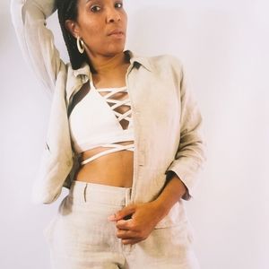Two piece wheat colored 100% linen set. Button down 3/4 sleeve collared top with two front pockets. Ankle length pants with zipper and 2 hook closure and pockets. Belt loops.