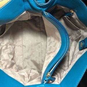 Gorgeous Michael Kors Teal Hamilton Leather Satchel. Gorgeous soft teal leather. Excellent preowned condition. Clean interior. Two large interior compartments with middle zip compartment, snap closure. The only flaws I see are two tiny pinpoint marks (one on back and one on handles as seen in last two photos.