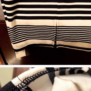Square neckline. Pullover style. 65% poly, 30% rayon, 5% elastane. Approx 40” in length, 28” bust, 24” waist. Colors are closest described as navy and off white.