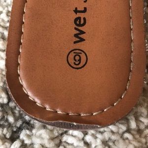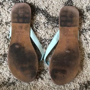 Light blue and brown faux leather flipflops from Wet Seal. Still in good condition with main flaw being a small tear in the sole of the right shoe.