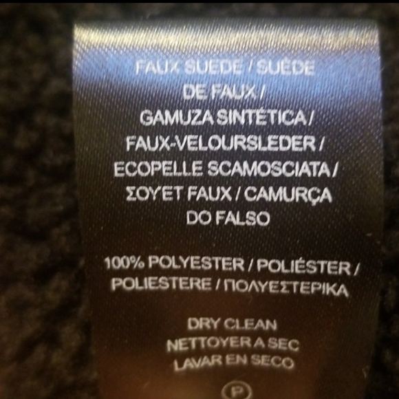 Faux suede. Zippers may not work, otherwise good condition. The metal pieces are hard to describe color wise, they are a hybrid bronze/gunmetal color. It's a size small.