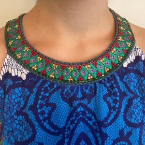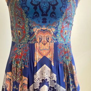 This is a highly unique dress from Anthropologie! It's highly colorful with a beautiful, intricate pattern, meticulous pleating details, and exceptional embroidered collar on the neckline. It has a hidden zipper on the side and hidden hook closure at the back of the neck. This piece is in pristine condition and very flowy, breezy, and comfortable to wear!