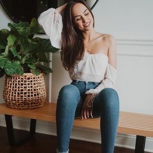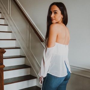A beautiful off the shoulders shirt. Tied sleeves to help adjust the length. A flowing hem can be tucked into jeans for a put together look. Sheer fabrication with a built in bra. Slit in the back.