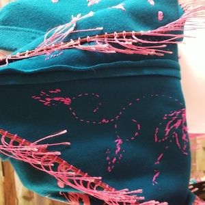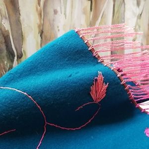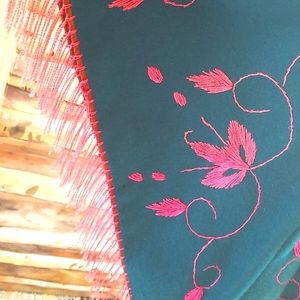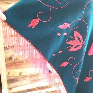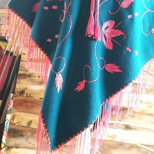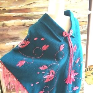 60's Hippie Fringe Teal Wool Pink Hand Embroidery Cape Shawl Poncho GUVC OSFA
