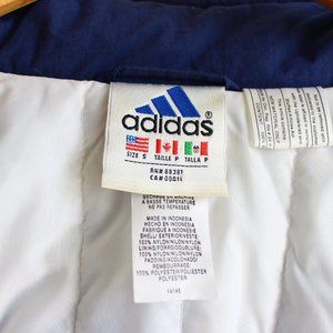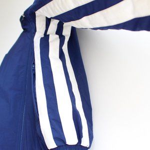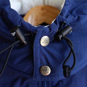 Vintage 90's Adidas insulated hooded winter jacket with navy & white color blocking. The signature "Adidas 3 stripes" decorate the bottom of the sleeves and goes all the way down to the sides. Massive logo embroidery exhibited on the back side and smaller one on the chest. Removable insulated hood. And best of all, porcelain white interior puffer lining which is not only pleasant to wear, but also strikingly eye catching. In great condition with minimal signs of wear. No scratches,rips or holes.