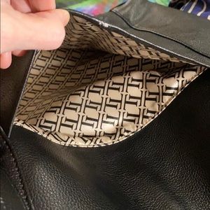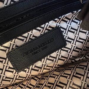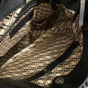 Tignanello Purse Genuine Leather. Black in color. Measures 13” wide and 12” tall. Outside on the front there is two zippered pockets and a flip up section with with a pocket and a section with card slots and ID holder. Inside has two large sections divided by a magnetic snap. One section closes with a zipper. The largest section has two open slotted pockets and one large zipper pocket. On the back there is an open pocket. This purse is in brand new condition.