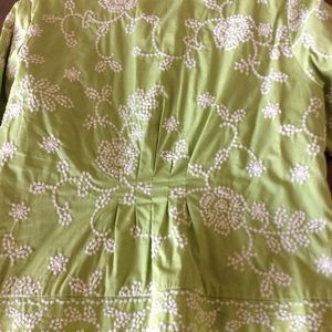 Beautifully detailed with white embroidery this Coldwater Creek jacket or top is as functional as it beautiful. Pleated back for a more feminine look. Great for an interview or happy hour with the girls. Easy to wear. Magnetic snap closure. EUC no stains, tears, or holes. Measurements and tags pictured.