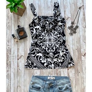 Create the perfect summer office outfit with this beautiful WHBM Floral Tank! This top has a gorgeous white and black floral pattern. It features the most flattering fit, and will pair perfectly with skirts, trousers, shorts or jeans! Measurements are: pit to pit 14” waist 12.5”
