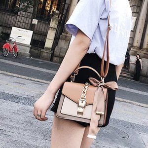 Silky ribbon meets glistening gold chain hardware in this super fashionable mini messenger bag. This luxury purse showcases a gorgeous brown and tan vegan leather. Locking gold front closure. Detachable shoulder strap. This state-of-the-art purse can be worn as a handbag or a crossbody. Take your purse collection to new heights with this beautiful leather handbag. ❤️