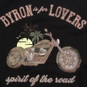 Black 'Bryon is for Lovers - Spirit of the Road' motorcycle tropical graphic tee.