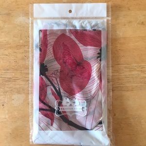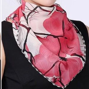 Pink floral chiffon facemask. This mask can also double as a scarf when not in use. Soft thin material. Elastic bands at the top to fasten mask around ears. NEW MASK. Never been worn. Comes in plastic.