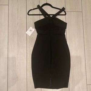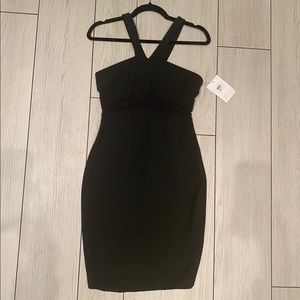 Black cocktail dress. Super cute with v top and mesh paneling on the bodice. Completely new with tags on. Size 4.