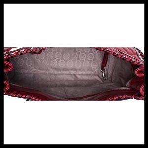 - Soft dark red quilted leather with polished silver tone hardware & grommet accents